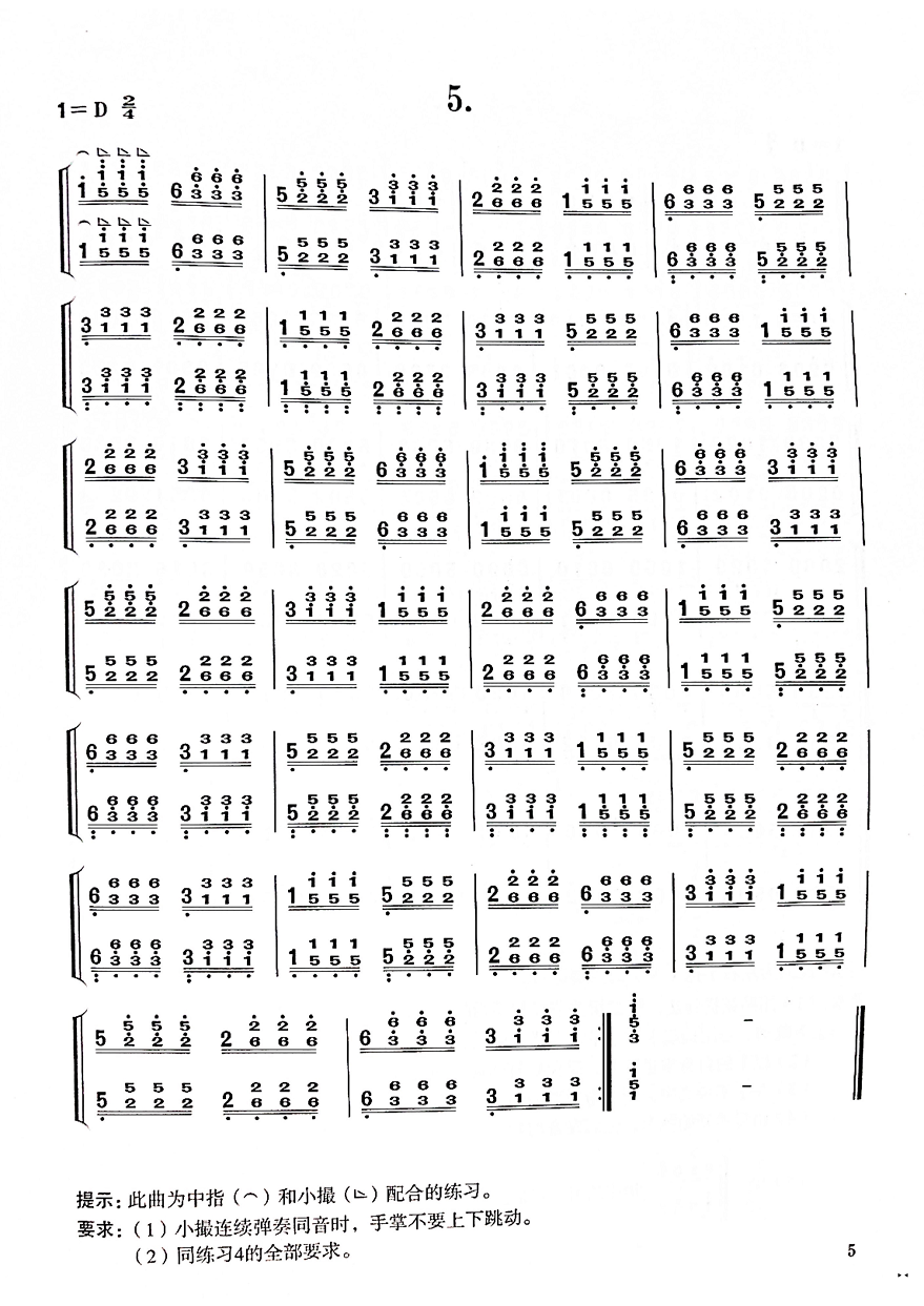 前两节古筝每日必弹带练教学视频主要对勾抹托、大撮和小撮指法的练习做了讲解,本节基本功带练配套视频是项斯华老师指序书的第5和6条视频,主要目的是在掌握了前两节基础上训练了同一根弦上多次反复弹奏、及快速换弦的移位能力。