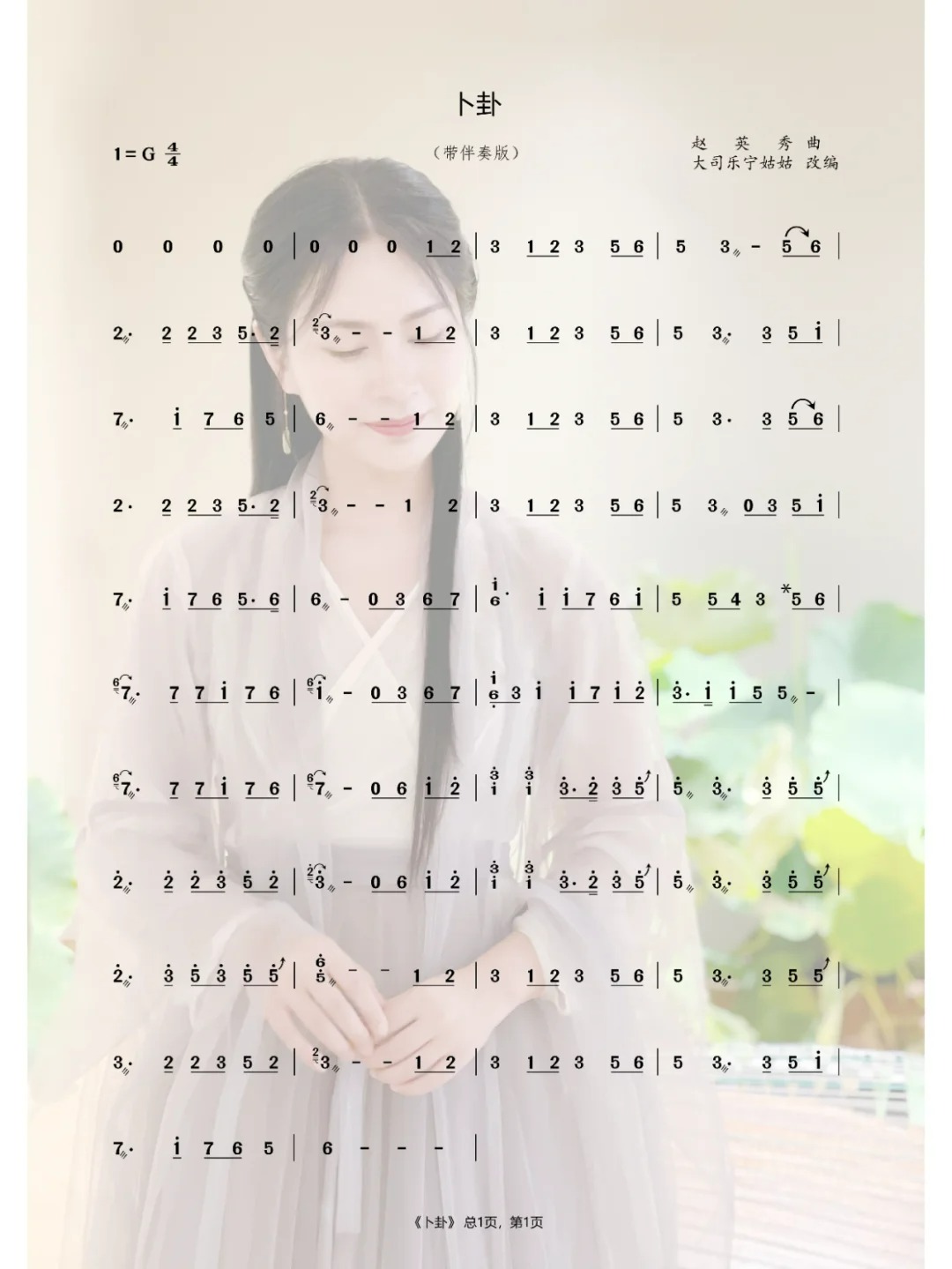 超火歌曲《卜卦》古筝d调带歌词版简谱