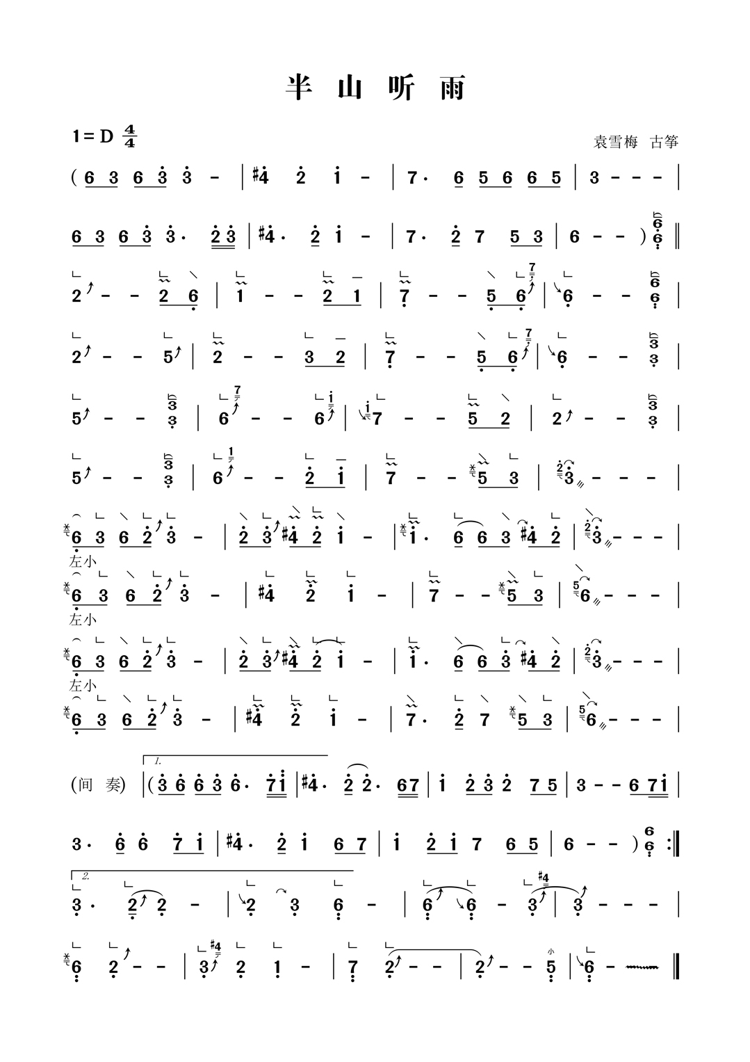 古琴曲《半山听雨》古筝d调简谱及伴奏下载