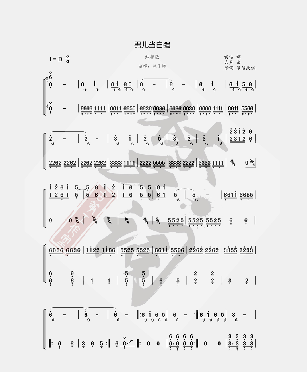 古筝曲《男儿当自强》d调简谱伴奏及演奏视频